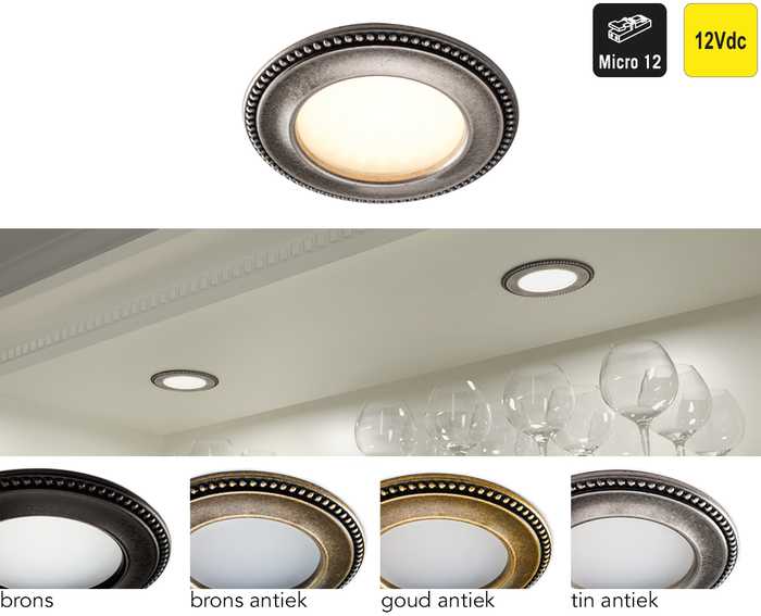 | 041563 | Goud antiek | Warm wit, 3000°K | 400 lux/120 lm | 12Vdc | 3W | 1 stuk |