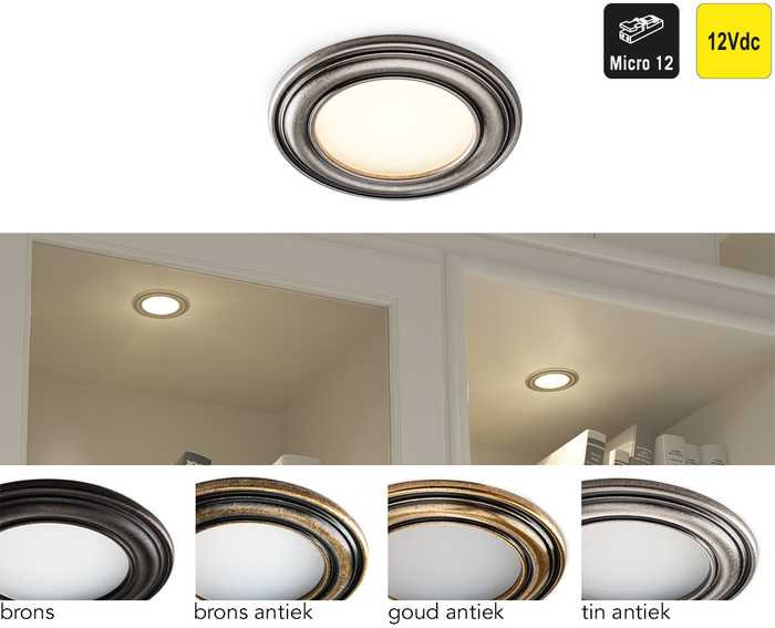 | 041565 | Tin antiek | Warm wit, 3000°K | 400 lux/120 lm | 12Vdc | 3W | 1 stuk |