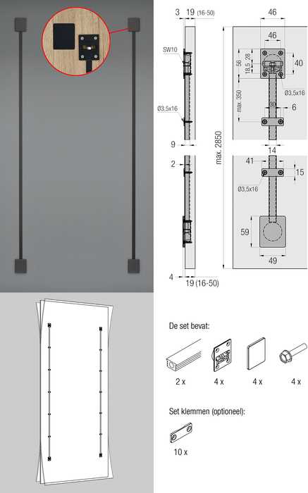 - de set bevat: 2 profielen, 4 bevestigingen,